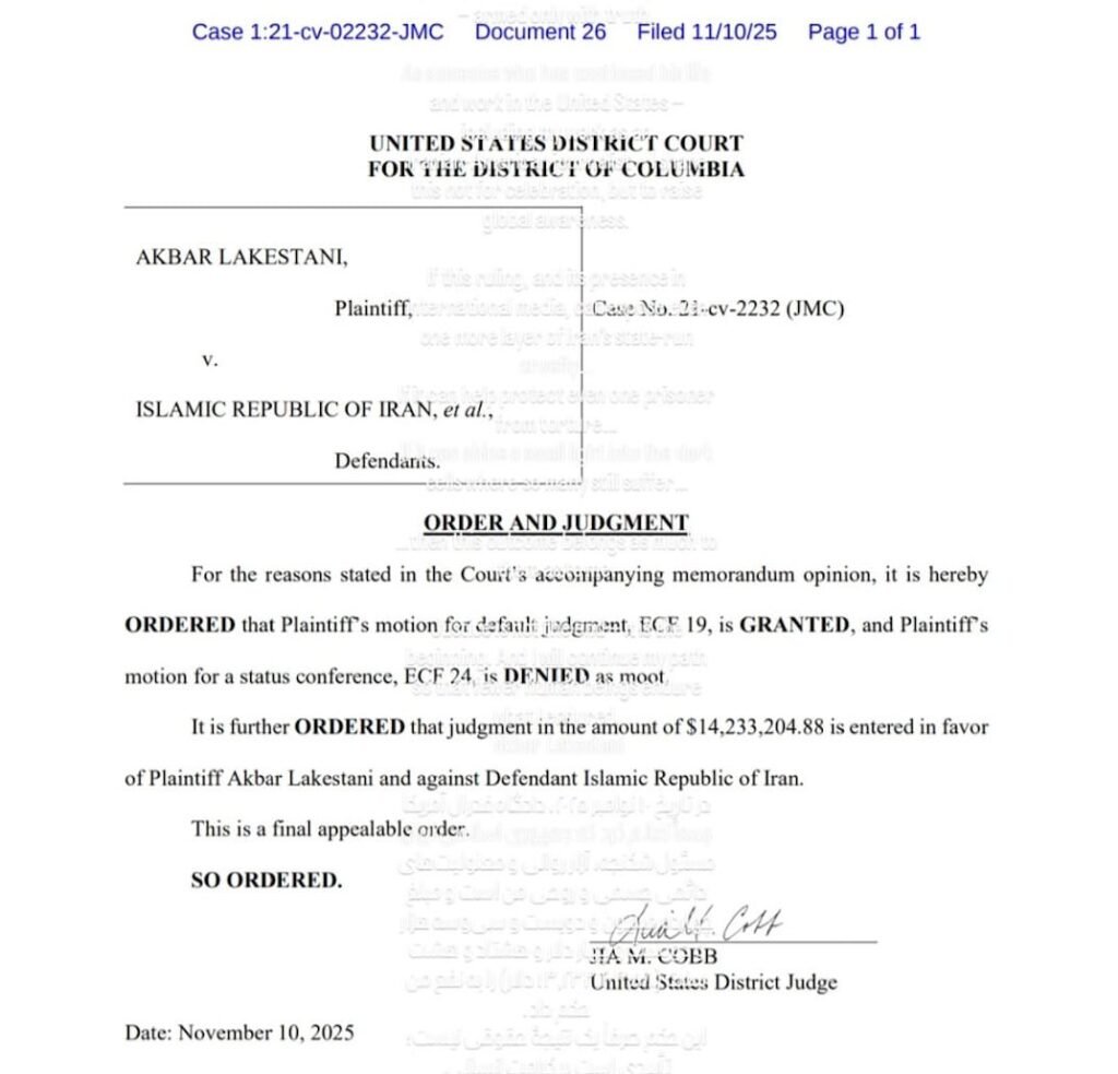 بدنبال شکایت اکبر لکستانی از جمهوری اسلامی ایران در رابطه با شکنجه در دوران بازداشتش در سال ۸۵ دادگاه منطقه کلمبیا دستور داد تا از محل اموال بلوکه ایران مبلغ ۱۴ میلیون دوست و سی و سه هزار دلار به وی غرامت پرداخت بشه. آقای لکستانی در خرداد ۱۳۸۵ در جریان تظاهرات ضد نژادپرستی آذربایجانیها بر علیه کاریکاتور روزنامه دولتی ایران رئیس شورای شهر شوط و چالدران بود و پس از اعتراضش در صحن علنی مجلس شورای اسلامی به سرکوب مردم آذربایجان بازداشت شد. در دوره بازداشت ماموران با بستن دستبند و پابند و سفت کردن این ادوات او را شکنجه کرده بودند که سبب عفونت انگشتان پای وی و در نهایت قطع انگشتان در آمریکا شد.به گفته آقای لکستانی این غرامت تنها مربوط به یکی از پرونده های باز شده از یوی اوعلیه جمهوری اسلامی ایران است و پرونده های دیگر هنوز در جریان است