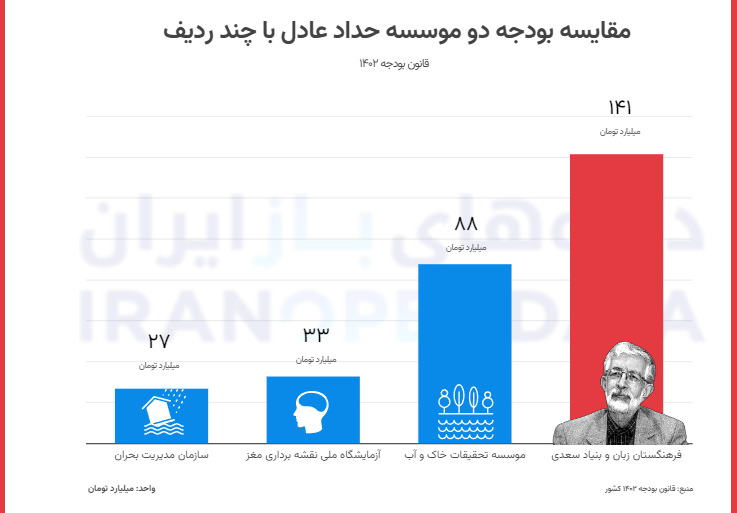 این گزارش روز ۱۹ اسفند منتشر شده است. حداد عادل در حال حاضر ریاست دو نهاد «فرهنگستان زبان و ادب فارسی» و «بنیاد سعدی» را بر عهده دارد. بنا بر این گزارش از سال ۱۳۹۱ تاکنون نزدیک به ۵۳۰ میلیارد تومان از منابع عمومی بودجه به این دو نهاد فاشیستی اختصاص یافته که با احتساب تورم، معادل ۱۷۵۰ میلیارد تومان در سال ۱۴۰۲ محسوب می شود.