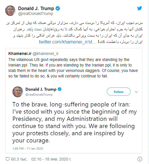 دونالد ترامپ در حساب کاربری توییتر خود نوشته است: «رهبر به اصطلاح معظم ایران که این اواخر چندان عظمتی برایش باقی نمانده، حرفهای بدی درباره آمریکا و اروپا زده است. اقتصاد آنها رو به نابودی است و مردمشان در عذاب. او باید خیلی مواظب حرف زدنش باشد».
