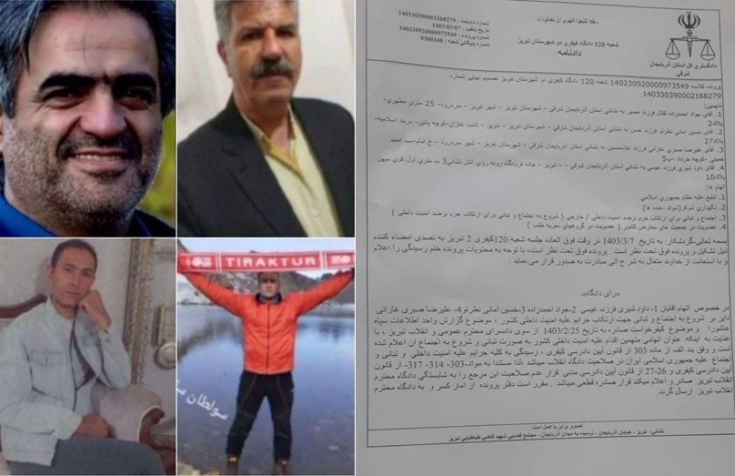 اتهام این فعالین ملی «تبلیغ علیه نظام جمهوری اسلامی» ، «(شروع)اجتماع و تبانی برای ارتکاب جرم بر ضد امنیت داخلی/خارجی» ، «عضویت در جمعیت های معارض کشور(عضویت در گروههای تجزیه طلب)» و «نگهداری شوکر» عنوان شده است که شعبه ۱۲۰ دادگاه کیفری دو شهرستان تبریز با اعلام اینکه رسیدگی به این اتهامات در صلاحیت شعبه مذکور نمی باشد این پرونده را به دادگاه انقلاب تبریز ارجاع داده است.