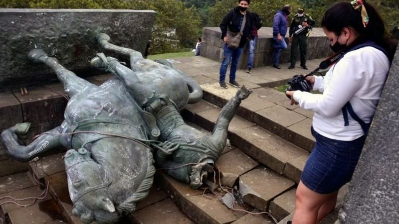 رهبران بومی کلمبیا میگویند که وی نماد پنج قرن نسل کشی و برده داری در کلمبیا است.