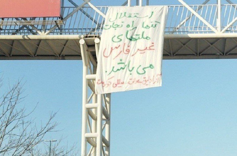 Plakatda “Müstəqillik qeyri-fars millətlərin yeganə qurtuluş yoludur. Ədalət, Azadlıq, Milli hökumət” yazılıb.