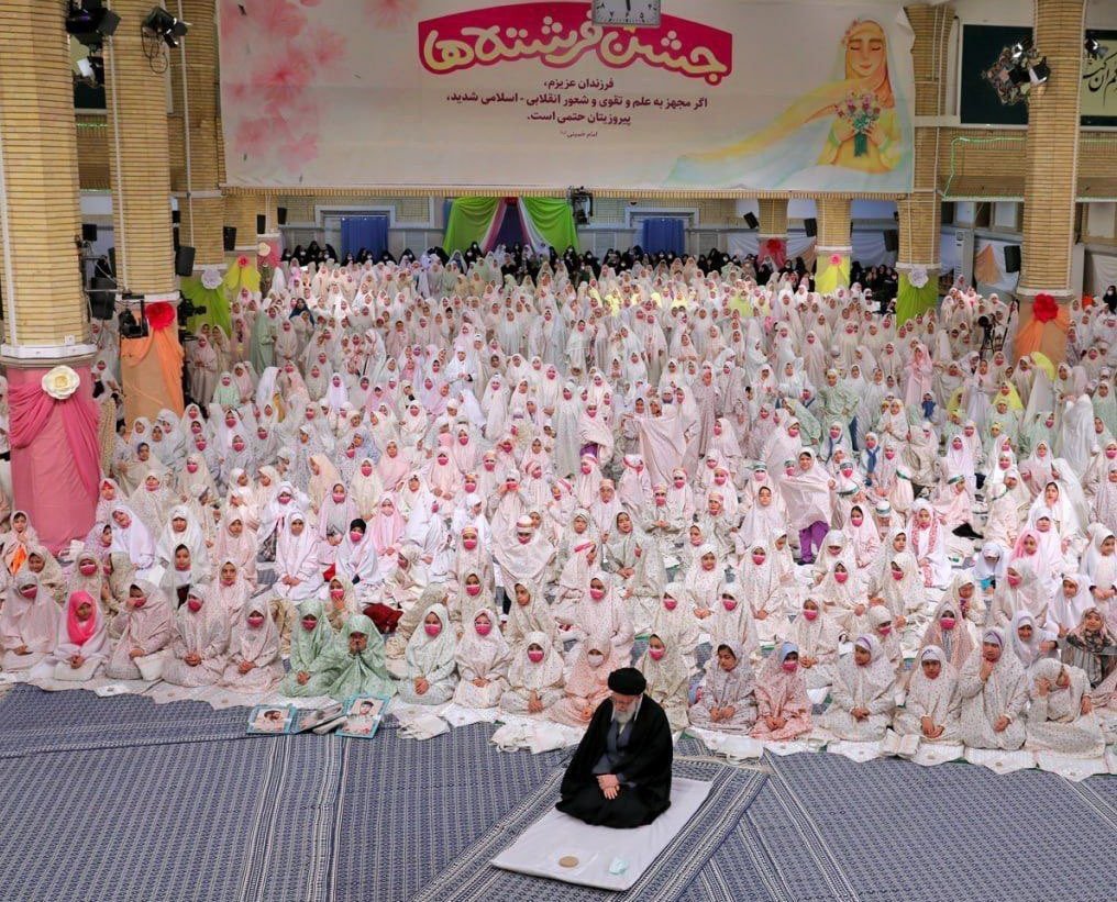 در این تصویرر ده ها تن از دختران 9 ساله در مراسم «آغاز بلوغ شرعی» که در ادبیات جمهوری اسلامی «جشن تکلیف» خوانده میشود، به دیدار رهبر جمهوری اسلامی رفتهاند.