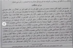 بر اساس دادنامه صادره توسط شعبه ۱۱۲ دادگاه کیفری دو شهر تبریز، محمد محمودی به اتهام «اخلال در نظم عمومی در اغتششات مرداد ماه ۱۴۰۰» به پرداخت مبلغ شصت میلیون ریال جزای نقدی بدل از یکسال حبس درجه شش و ده میلیون ریال جزای نقدی بدل از شلاق با احتساب ایام بازداشت قبلی در حق صندوق دولت محکوم شده است.
