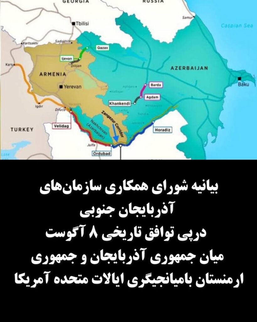 ما، به عنوان شورای همکاری سازمانهای آذربایجان جنوبی، ضمن تبریک این توافق تاریخی به ملت و دولت جمهوری آذربایجان و تمامی طرفهای مؤثر در ایجاد صلح و ثبات در قفقاز، خواستار اجرای هرچه سریعتر مفاد توافق و تسهیل روند همگرایی در قفقاز، جهان تُرک و بهویژه آذربایجان جنوبی هستیم. همچنین با قاطعیت هرگونه پروپاگاندا و یا اقدامات تخریبی علیه این توافق تاریخی را محکوم میکنیم.