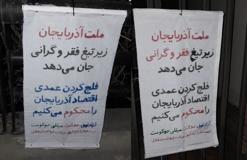 در بنرهای جداگانهای که همزمان در محلات شهر تبریز نصب شده، متون « ملت آذربایجان زیر تیغ فقر و گرانی جان میدهد / فلجکردن عمدی اقتصاد آذربایجان را محکوم میکنیم»، «آزادلیق، عدالت، میللی حوکومت / اینسانلارا آزادلیق، میللتلره ایستیقلال»، «آذربایجان غرق در ثروتهای طبیعی ولی مردمانش کارگران شهرهای مرکزی» ، «آزادلیق، عدالت، میللی حوکومت»و «#به_غارت_آذربایجان_پایان_دهید» نقش بسته است.