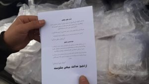 فعالین مدنی در آخرین مورد اقدام به توزیع اعلامیه حمایتی از زلزله زدگان همراه با غذا کرده اند. در قسمتی از متن اعلامیه آمده است: