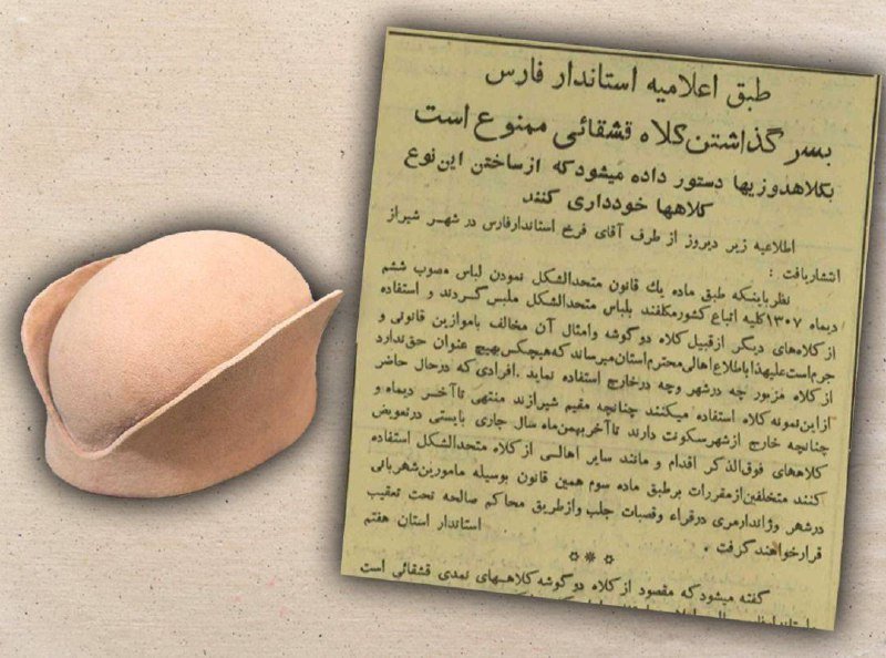 «نظر به اینکه طبق ماده یک قانون متحدالشکل نمودن لباس مصوب ششم دی ماه ۱۳۰۷ کلیه اتباع کشور مکلفاند به لباس متحدالشکل ملبس گردند و استفاده از کلاههای دیگر از قبیل: کلاه دوگوشه ۱ و امثال آن مخالف با موازین قانونی و جرم است، علیهذا به اطلاع اهالی محترم استان میرساند که هیچکس به هیچ عنوان حق ندارد از کلاه مزبور چه در شهر و چه در خارج استفاده نماید. افرادی که در حال حاضر از این نمونه کلاه استفاده میکنند چنانچه مقیم شیرازند منتهی تا آخر دی ماه و چنانچه خارج از شهر سکونت دارند تا آخر بهمن ماه سال جاری بایستی در تعویض کلاههای فوقالذکر اقدام و مانند سایر اهالی از کلاه متحدالشکل استفاده کنند. متخلفین از مقررات بر طبق ماده سوم همین قانون به وسیله مامورین شهربانی در شهر، و ژاندارمری در قراء و قصبات جلب و از طریق محاکم صالحه تحت تعقیب قرار خواهند گرفت. استاندار استان هفتم.»