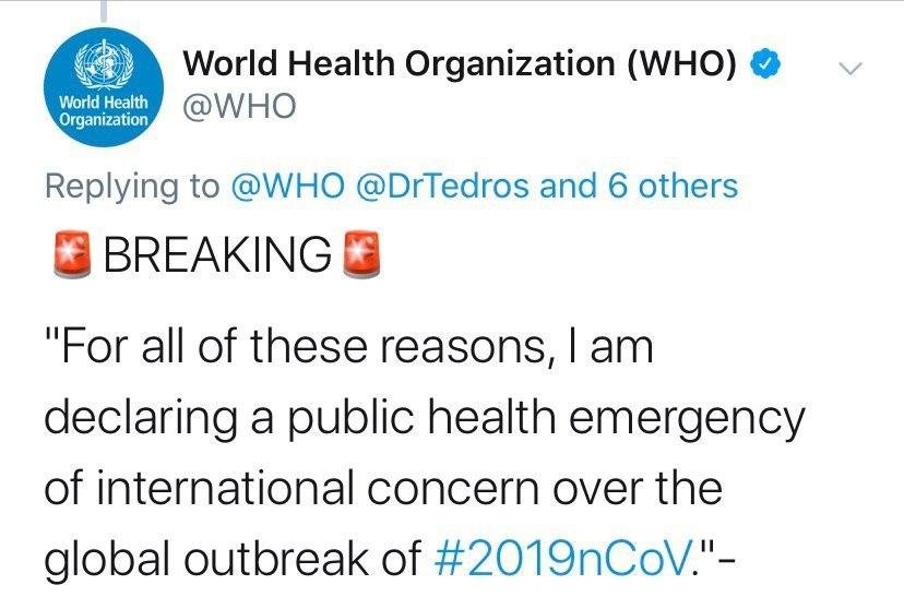 سازمان جهانی بهداشت دقایقی پیش شیوع کروناویروس جدید در چین را به‌عنوان یک وضعیت اضطراری بهداشتی جهانی اعلام کرد.