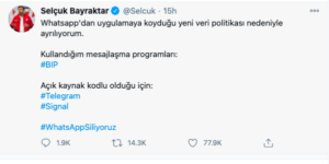 سلجوق بایراکتار نوشت که دلیل این امتناع، قوانین جدید امنیتی پیامرسان واتساپ میباشد که اخیراً بروزرسانی شده و طبق آن همه اطلاعات مربوط به کاربران از سوی این پیامرسان مورد استفاده قرار میگیرد.