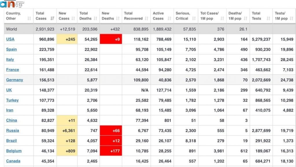 به گزارش ای ان تی به نقل از وبسایتهای رصدکننده آمار کرونا در جهان تا این لحظه یکشنبه ۷ اردیبهشت، ۲ میلیون و ۹۲۴ هزار و ۵۴۰ نفر در جهان به ویروس کرونا (کووید ۱۹) مبتلا شدهاند که از این تعداد، ۲۰۳ هزار و ۳۴۷ نفر جان خود را از دست دادهاند.