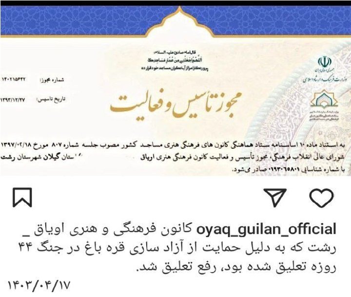 مجوز تاسیس و فعالیت کانون فرهنگی و هنری اویاق رشت
