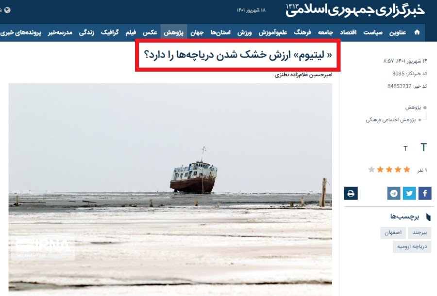 لازم به ذکر است چند روز پیش خبرگزاری رسمی دولت ایران «ایرنا» از وجود منابع زیاد لیتیوم در دریاچه اورمیه خبر داد و آشکارا اعلام کرد یکی از دلایل عدم نجات این دریاچه از خشک شدن، سود حاصل از استخراج این فلز کمیاب می باشد.