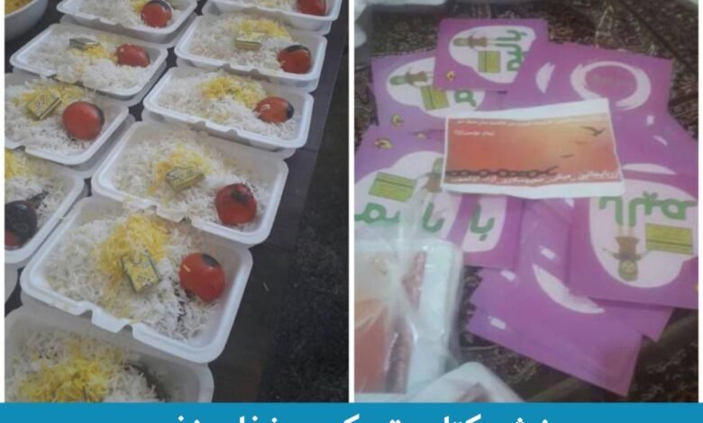 کتابها شامل داستانهای تورکی کودکانه بوده و پخش غذاها همراه با چاپ نوشته با متون “ان بؤیۆک جیهاد ظالیمین قارشیسینا کئچیب سن حاقسیزسان دئمک دیر.ایمام حۆسئین (ع)”، #آذربایجانین_میللی_محبوسلاری_آزاد اولسون” بوده است.