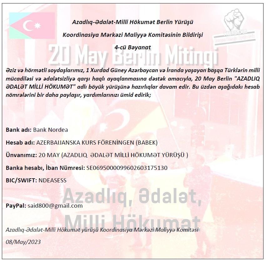 Əziz və hörmətli soydaşlarımız, 1 Xurdad Güney Azərbaycan və İranda yaşayan başqa Türklərin milli mücadiləsi və ədalətsizliyə qarşı haqlı ayaqlanmasına dəstək amacıyla, 20 May Berlin “AZADLIQ ƏDALƏT MİLLİ HÖKUMƏT” adlı böyük yürüşünə hazırlıqlar davam edir. Bu üzdən aşağıdakı hesab nömrələrini bir daha paylaşır, yardımlarınızı ümid edirik;