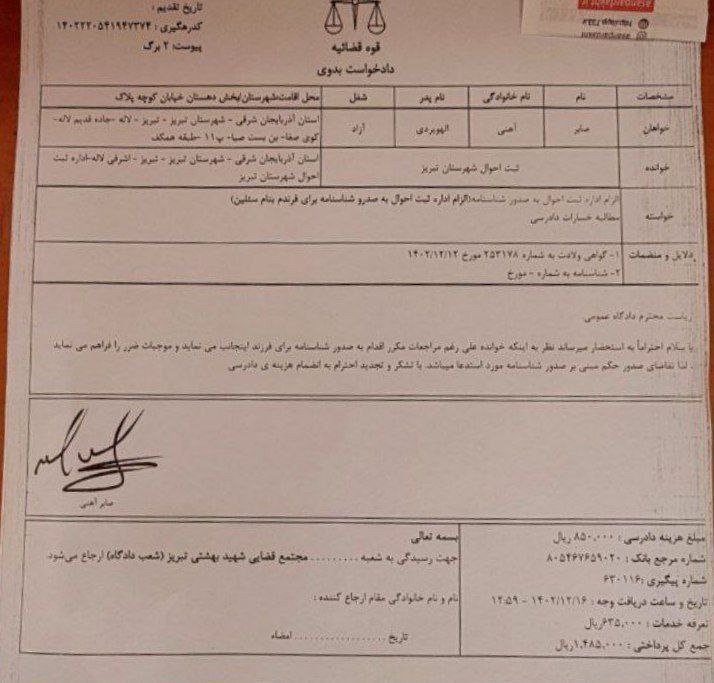Selinin atası Sabir Əhani Təbriz şəhəri Qeydiyyat İdarəsinə etdiyi yazılı şikayətin şəklini çəkərək şəxsi İnstagram səhifəsində paylaşıb.