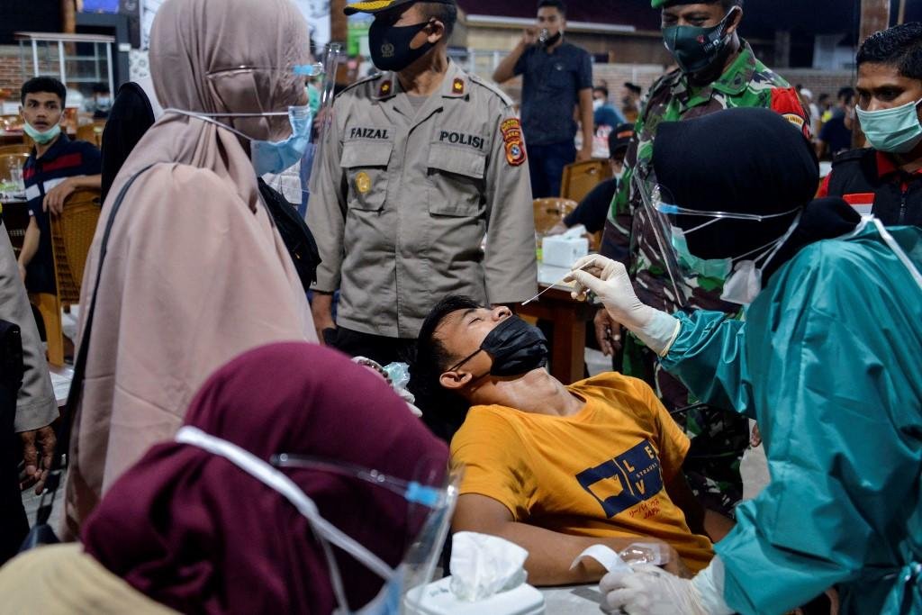 This photo taken on May 10, 2021 shows a health worker taking a swab sample from a man for the Covid-19 coronavirus at a coffee shop in Banda Aceh. (Photo by CHAIDEER MAHYUDDIN / AFP)