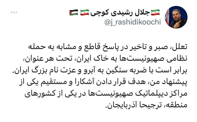 “Sionist rejimin İran torpağına hücumuna qəti cavab verməkdə tərəddüd və səbr etmək, İranın izzət və abırısına ağır zərbədir. Təklif edirəm ki, cavab olaraq bu ölkənin qonşu ölkələrdəki iplomatik mərkəzlərindən birinə, əsasən Azərbaycandakı nümayəndəliyinə zərbə endirilsin”,- Kuçi teklif edib.