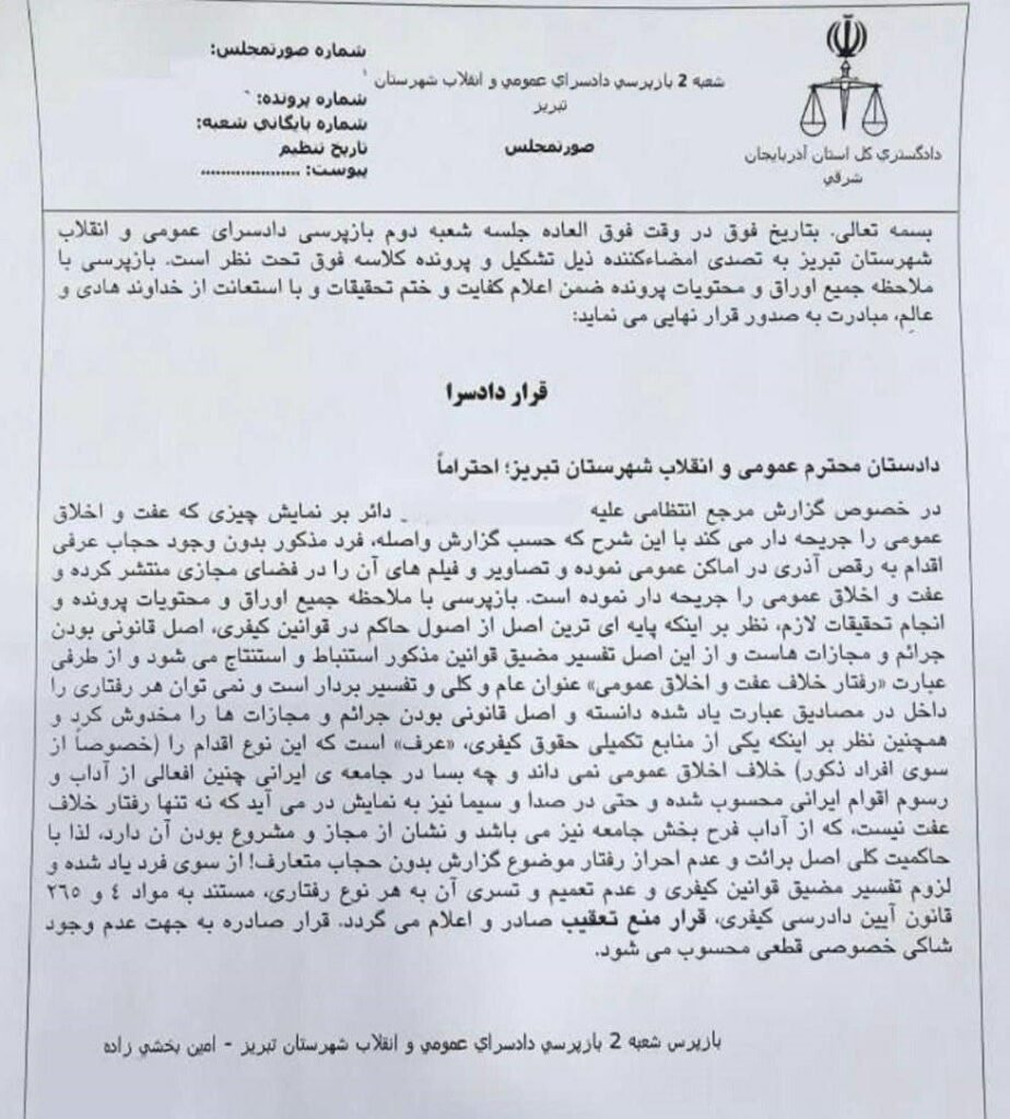 Polis əməkdaşları Azərbaycan rəqsini ifa edərək sosial şəbəkədə paylaşan vətəndaşdan şikayət ediblər. Sözügedən məsələyə Təbriz Baş İnqilab Prokurorluğunun 2-ci istintaq şöbəsində baxılıb. Qurumun müstəntiqi şikayəti təmin etməyib. Həmin şikayətin hüquqi müstəvidə digər instansiyalarda baxılmasına da qadağa qoyulub
