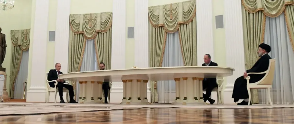 The Putin-Raisi January 21 meeting fed speculation over the table’s placement – for some as an intentional act to imply “distance” – over Putin apparently chewing gum, and over the absence of the two countries’ flags in the hall. A video released by Russian media after the visit apparently showed Raisi leaving the Kremlin without being seen off by Russian officials.