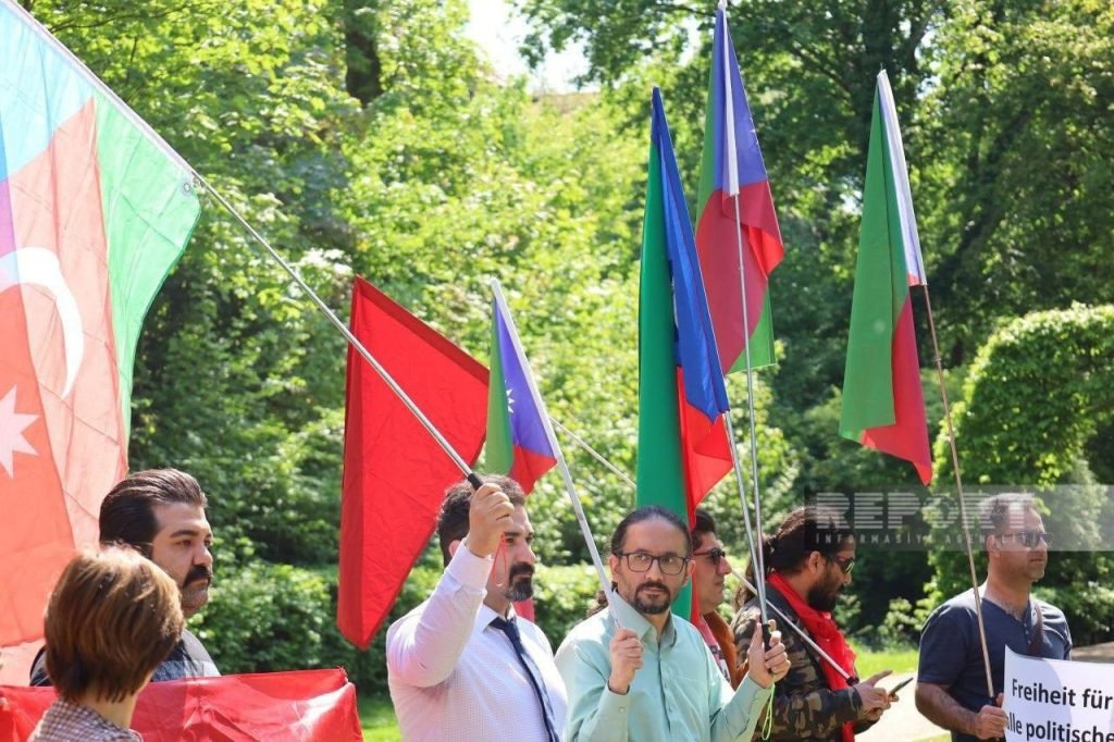 İran konsulluğunun qarşısında keçirilən aksiyanın sonunda iştirakçıların farsca və almanca birgə bəyanatı oxunub (Report).
