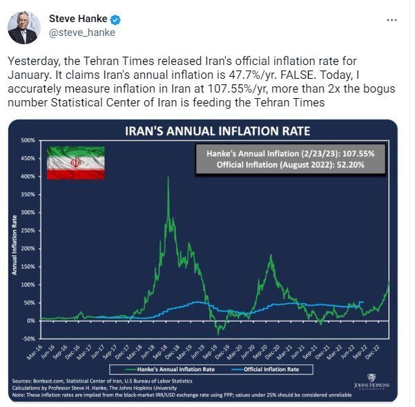 Qeyd edək ki, Con Hopkins Universitetinin iqtisadiyyat professoru Stiv Hankenin çərşənbə axşamı dərc etdiyi cədvələ əsasən, İran illik 102% inflyasiya ilə dünyada altıncı yerdədir.