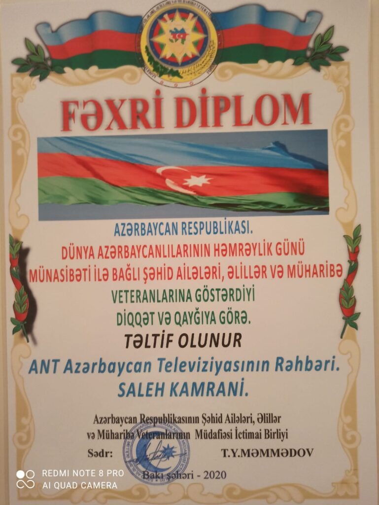ANT Televiziyasının rəhbəri Saleh Kamrani Azərbaycan cümhurisinin Şəhid Ailələri, Əlillər və Savaş döyüşçülərinin Müdafiəsi İctimai Birliyinin başqanı Tahir Məmmədov tərəfindən Dünya Azərbaycanlılarının Həmrəyliyi Günü münasibətilə şəhid ailələri, əlillər və savaş döyüşçülərinə göstərdiyi diqqət və qayğıya görə fəxri diploma layiq görülüb.