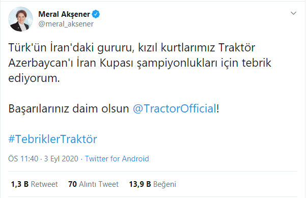 Dünən axşam Tiraxturun “Həzfi-cam”da qəhrəman olması sadəcə Azərbaycan millətini deyil, dünyanın hər yerində olan oydaş, dildaş və qardaşlarımızı da sevindirdi. Habelə siyasi və ictimai şəxsiyyətlər, o cümlədən Türkiyənin İYİ partisi başqanı Meral Akşener, Ankara Şəhrdarı Mansur Yavaş, MHP-li millət vəkili Ruhi Ersoy, profsor Ümit Özdağ, Yavuz Ağıroğlu, İraq Türkmənelinin başqanı tuit ataraq Azərbaycan millətinə təbrik deyib.