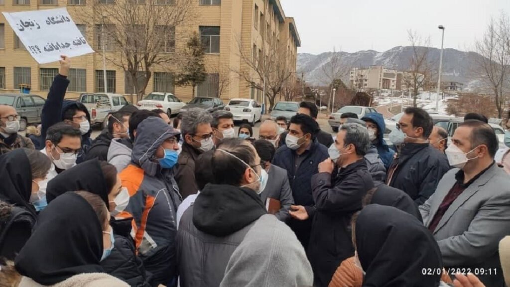 Tibb işçiləri əllərində “Zəngan Universiteti bizdən deyil” yazılmış plakat qaldırıb, universitetin tibb işçilıərinin acınacaqlı durumu ilə bağlı tədbir görmədiyini söyləyiblər.